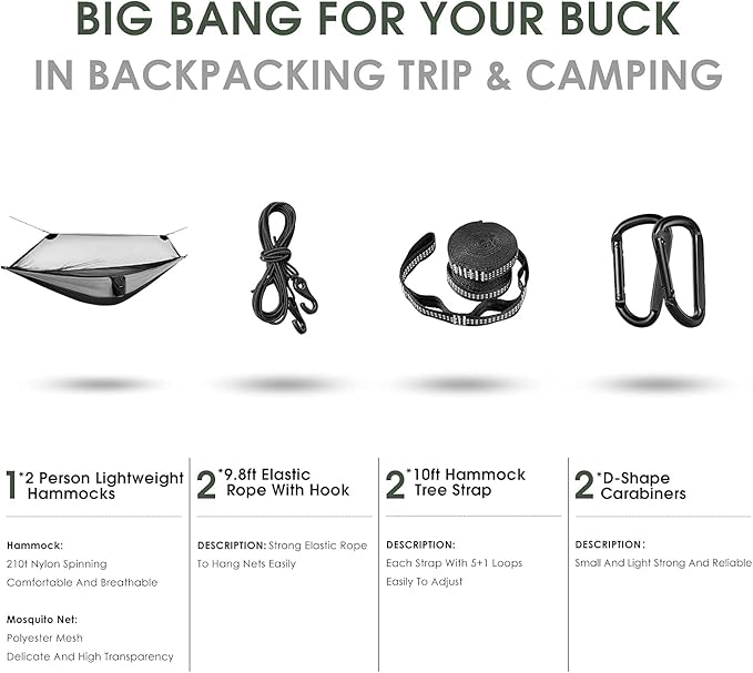 • Easy to set: wrapped the straps around two opposing trees and clipped the steel D-shape carabiners in the loop ends,easy to hang, comfortable for sleeping, packing it up is ridiculously quick and easy.