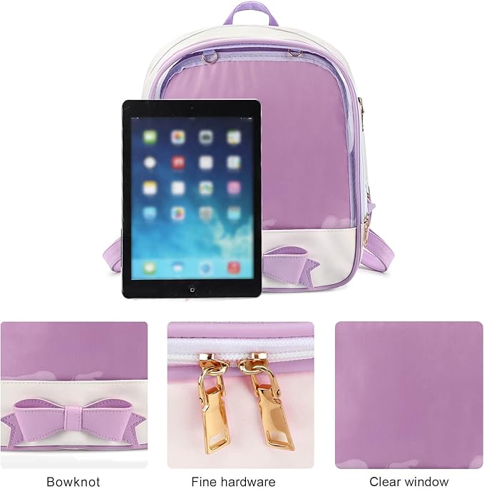 • ✿Structure✿:The ita backpack have a transparent window with glitter(No chains),you can display your anime pins.Two hooks,you can hang keychains on it.One main pocket for some books or ipad.Two inside pocket for keys or coins.