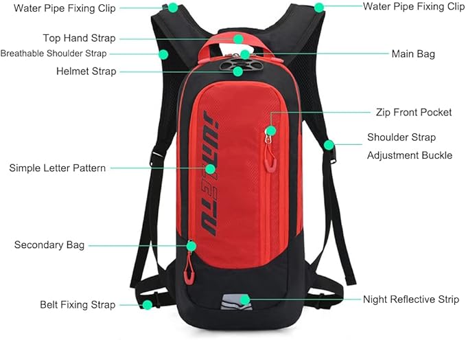 • Multiple Storage Compartment: The hydration backpack has multiple pockets that give you all the space you need to store your various necessities. It provides ample room for your outdoor essentials which includes sports towel, hat, phone, snacks, key and etc. The differently sized pockets will suit all your storage needs perfectly as required. In addition, the backpack can also fix the helmet, which brings great convenience to your journey.