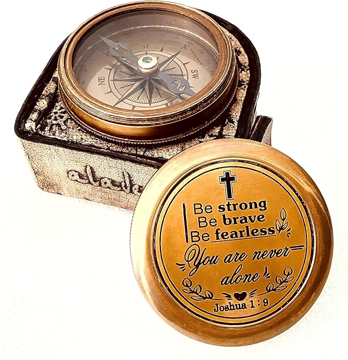 • Inspirational Gifts for Men & Women :- Handmade Vintage look Functional Brass Compass with engraved Be Strong and Courageous greeting. Perfect gadget for camping, hiking & trekking for navigators with a steampunk style