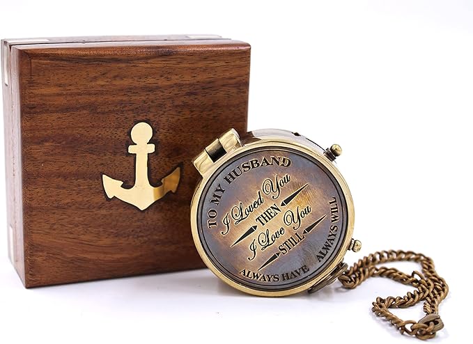 • BEAUTIFULLY CRAFTED - Antique brass compass is corrosion resist, packed in a hand made Wooden Storage case & a Chain with Engraved Quote "To My Husband, I love you". Under the Tough Glass Cover Is A Beautiful, Detailed Brass Compass Which Will Help You Find and Navigate Your Way Home.