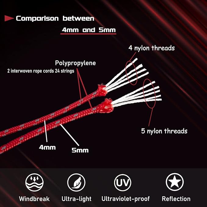 • 🌳Materials: Nylon(inner)+ Polyester(surface)+Reflective Cord,Combines the advantages of various materials,the windproof tent guy lines is Water, Moisture, UV, Weather Resistant,Great design for outdoor activities.