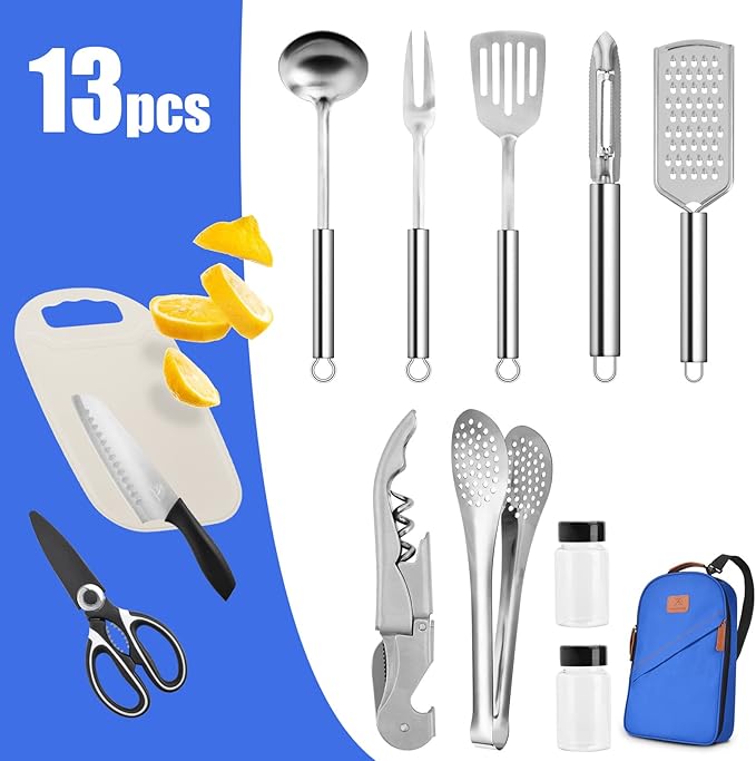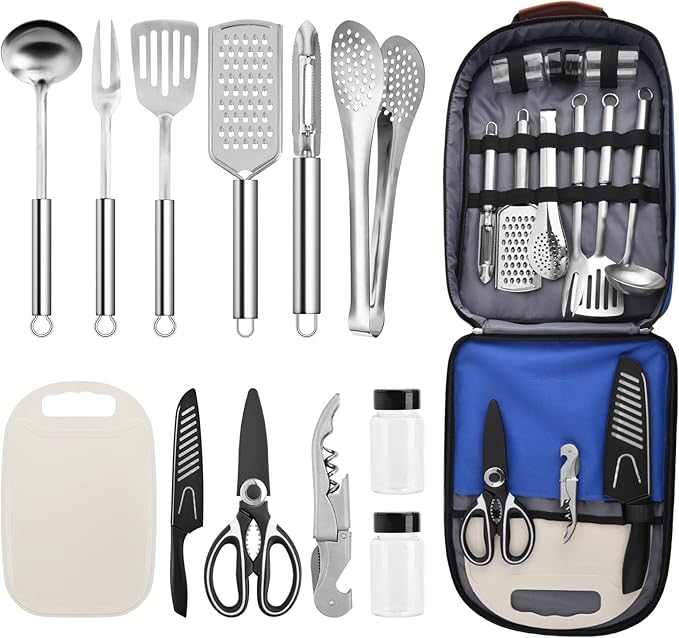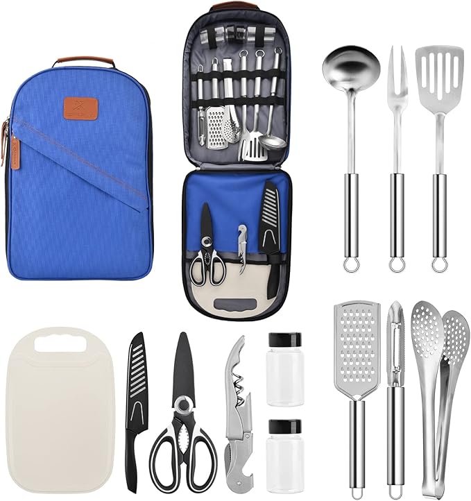 • Stylish Design - These camping cooking utensils are 100% stainless steel with a sleek chrome color finish for each cooking utensil. This camping cooking set comes in convenient color schemes that fit your outdoor aesthetic, so choose one that suits your style. The camping kitchen utensil set makes a great gift for campers, hikers, nomads, or anyone who appreciates an outdoor lifestyle.