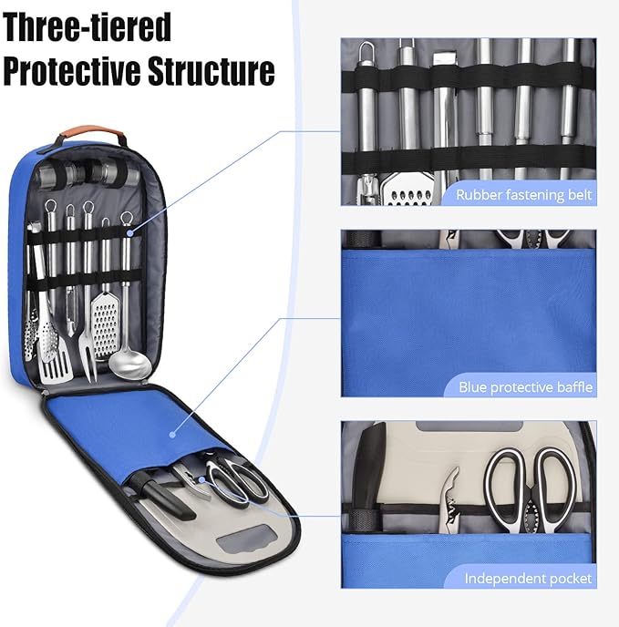• 3 Layer Storage - This camping cooking utensils set has all you need to prepare an outdoor meal. Made of 100% Oxford Woven Fabric, this compact storage backpack organizes your utensils in one convenient place and protects them from the elements with a three-layer protective interior structure. Water-resistant PVC coating and EPE foam lining provide maximum protection. And multiple storage compartments prevent your cooking utensils from scratching or clanging while on the move.