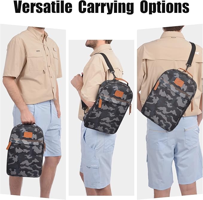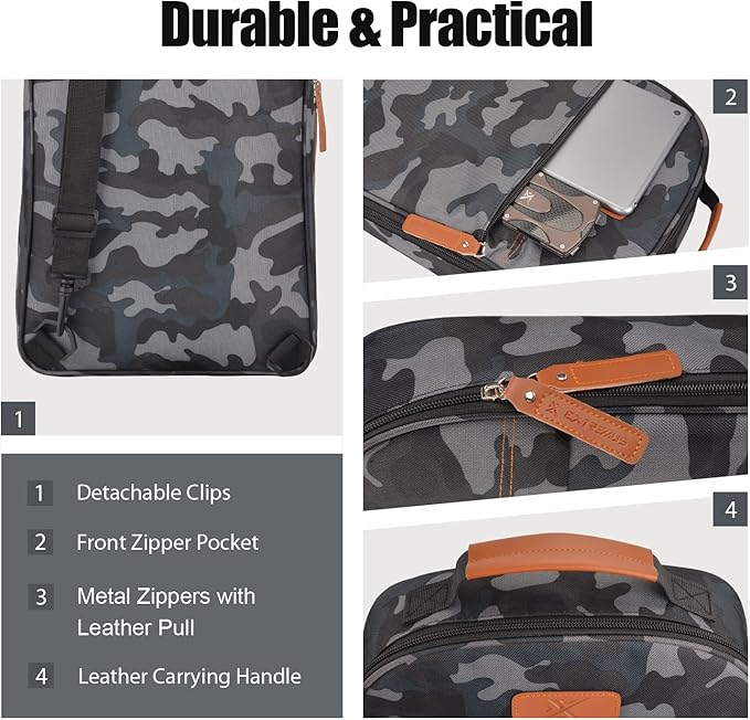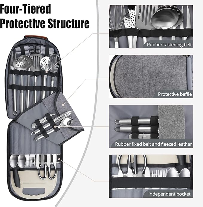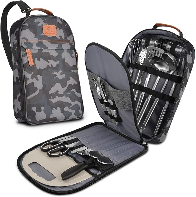 • Lightweight and Portable - This portable camping kitchen utensil set is compact, lightweight, and easy-to-carry. The camping backpack weighs under 4 lbs. Ideal for campers on the move, this backpack has 3 carrying options with a reinforced leather stitched carrying handle for hanging and holding, plus an adjustable shoulder strap to wear on your shoulder or as a cross-body bag. The camping cooking utensil backpack also has dual metal zippers with leather pull-tabs for easy opening and closing.