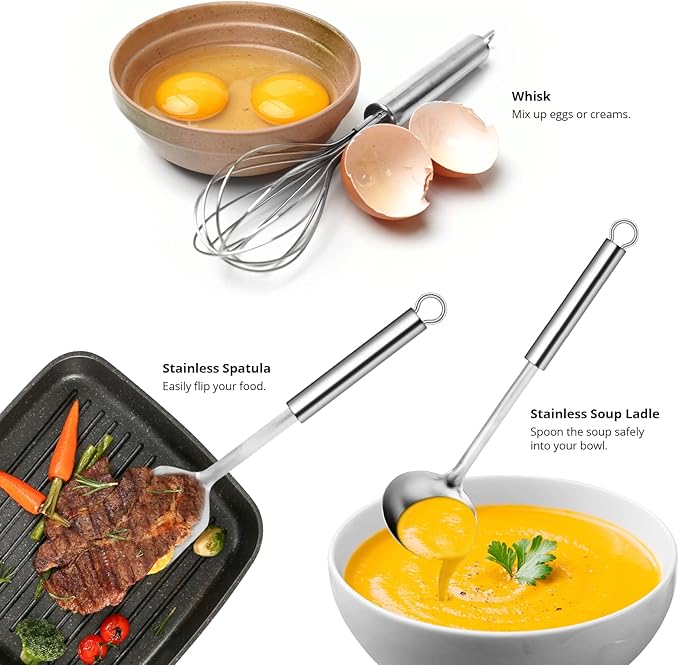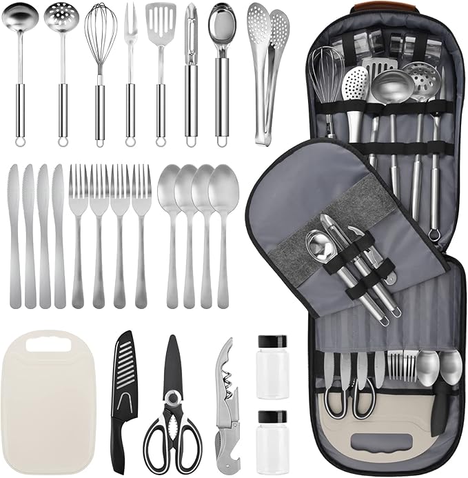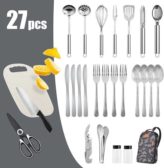 • Stylish Design - These camping cooking utensils are 100% stainless steel with a sleek chrome color finish for each cooking utensil. This camping cooking set comes in convenient color schemes that fit your outdoor aesthetic, so choose one that suits your style. The camping kitchen utensil set makes a great gift for campers, hikers, nomads, or anyone who appreciates an outdoor lifestyle.