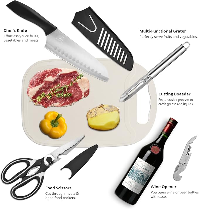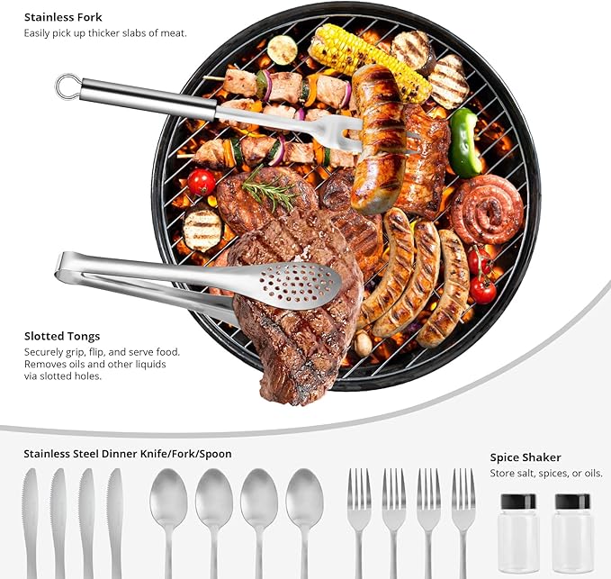 • Take Anywhere You Go - Built for everyday food preparation, this camping kitchen utensil set can travel with you anywhere you cook. Whether you’re out grilling burgers on a campground with the tongs and fork, cooking fish on a boat with the knife and cutting board, preparing dishes in an RV with the spice shakers and ladle, or just enjoying a meal in your backyard with the kitchen set, these portable camping utensils will fit all your cooking needs.