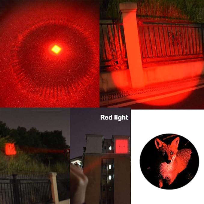 • Usage of Red flashlight and Green flashlight: Human's eyes are most sensitive to the red or green range of light, but the red light or the green light is less sensitive for the animals in the dark, like hogs, coyotes, fox...so you can find them without disturbing them. They are good for night hunting observation.