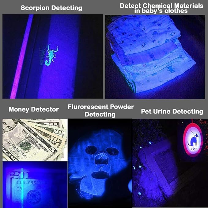 • Usage of 395 UV flashlight: It's used as the pet stain detector; It reveals hidden anti-counterfeit symbols; It's also used to Inspect hotel rooms, to detect scorpions at night, and to show UV dyes when looking for fuel or gas leaks.