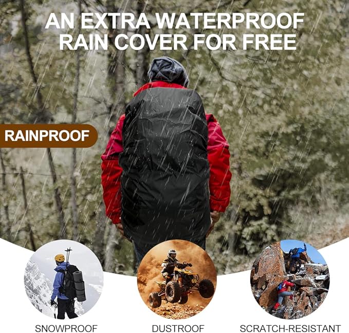 • 🕐【HIGH QUALITY & DOUBLE WATERPROOF BACKPACK】: Our INOXTO Hiking Backpack is made of sturdy ripstop water-resistant Polyester Material. KAM zippers - durable zipper, well-sewn craftsmanship, high dense stitching. Built with strong stitching in the places you need it such like the shoulder straps, carrying handle, bottom and other places. With waterproof rain cover for free prevents your outdoor gear from getting wet in drizzle, not afraid the rain anymore.