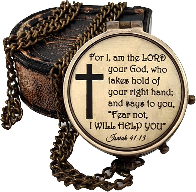 • Product Specifications: The compass with the leather case has a message from the Bible engraved on its outside. It says “For I am the LORD your God, who takes hold of your right hand; and says to you, “Fear not, I WILL HELP YOU” - Isaiah 41:13”. The compass measures 2.36 x 1.97 x 0.71 inches and weighs120 gms.