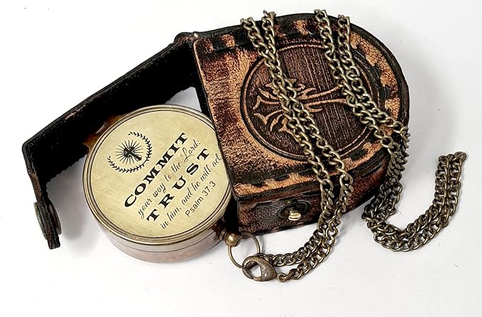 • Product Specifications: The Vintage Compass and Case Set has a removable chain that can be attached to a ring at the head of the antique decor compass gift. It is engraved with the psalm “COMMIT your way to the Lord: Trust in him. And he will act – Psalm 37:3” and has wings on either side.