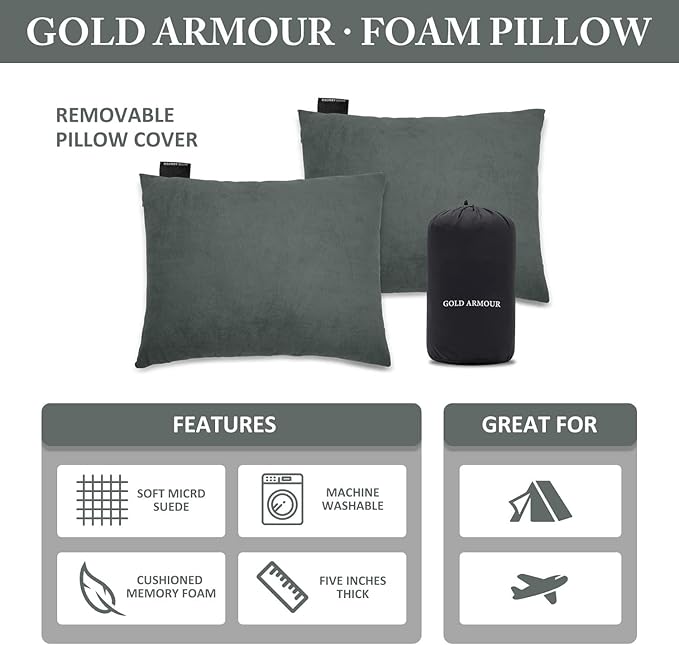 • COMFORTABLE: Our Gold Armour pillow is stuff with cushioned memory foam and wrapped in a soft, micro-suede cover. This travel pillow gives you a well deserved supportive rest that your head and neck will thank you for! Our compressible pillow can also be used as a seat cushion too