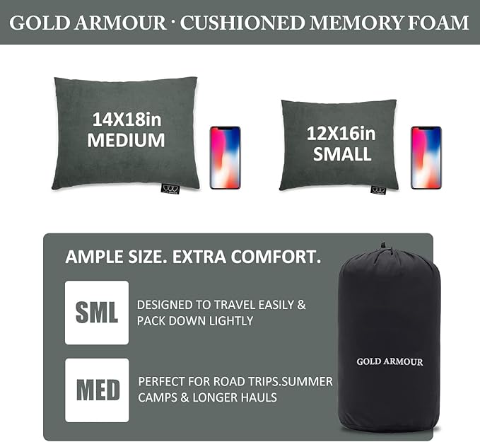 Gold Armour Camping Pillow Memory Foam - Compact Compressible Backpacking, Hammock, and Travel Pillows for Kids and Adults - Essential Outdoor & Camping Gear (Medium 14x18in, Gray)