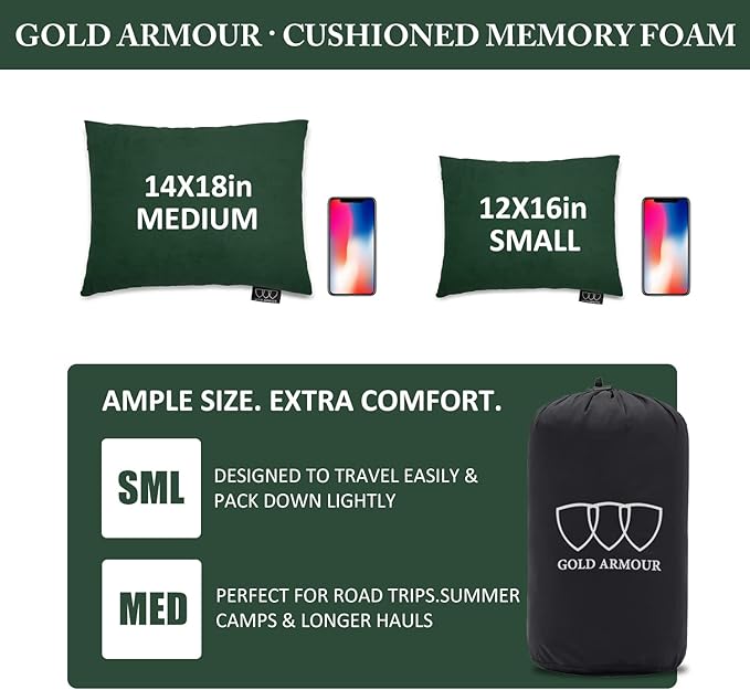 Gold Armour Camping Pillow Memory Foam - Compact Compressible Backpacking, Hammock, and Travel Pillows for Kids and Adults - Essential Outdoor & Camping Gear (Medium 14x18in, Green)