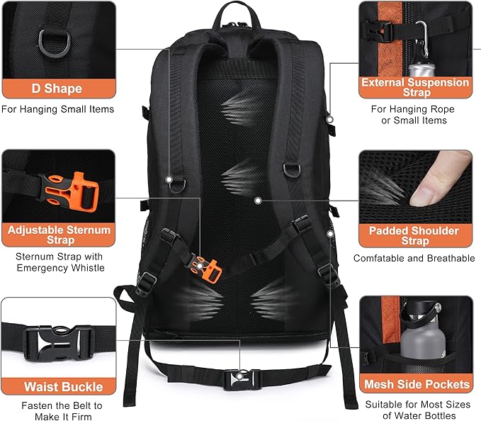 • Daypack: Easy to carry:The 40L hiking backpack is lightweight and it’s breathable mesh shoulder straps with plentiful sponge padding help to relieve the stress from your shoulder. The large capacity of 40L provides enough space for outdoor travel,camping,hiking and fishing. It meets size requirements for most airlines. This camping backpack can be used as hiking backpack, travel bags and backpacking backpack,which is suitable for men and women
