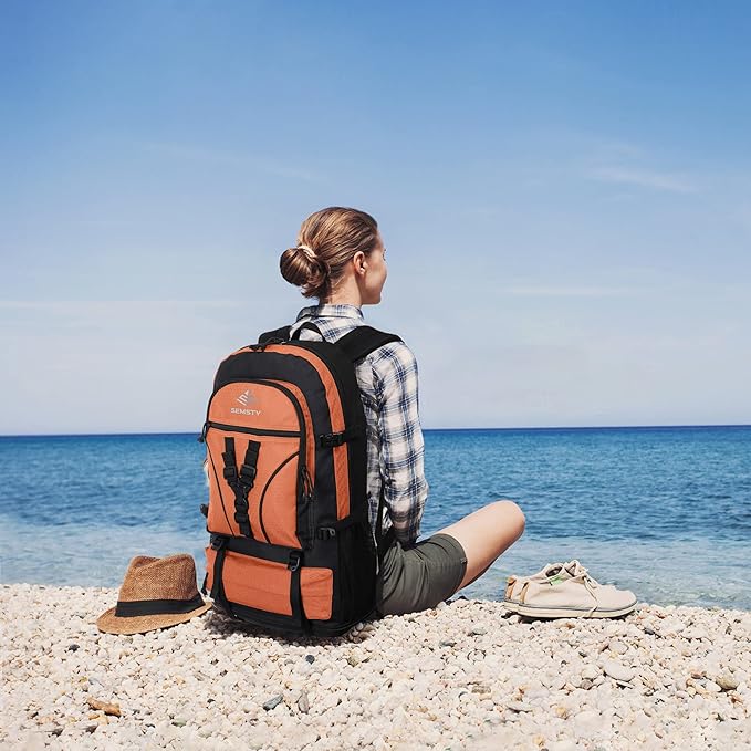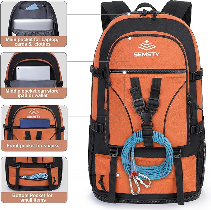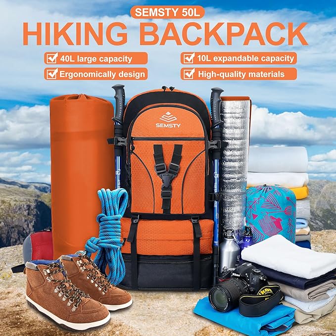 • Expandable & Extra Large Capacity: SEMSTY hiking backpack can be expanded by using the zipper at the bottom (from 40L to 50L). Roomy enough for a CARRY ON. The side buckles make your stuffs safe and make the backpack not too bulged even it's fully packed. Multi-compartments can hold everything you need in travels, such as phone, bottles, umbrella or camping supplies etc. You can easily organize all your essential stuffs. An outdoor backpack perfect for hiking, camping and travel