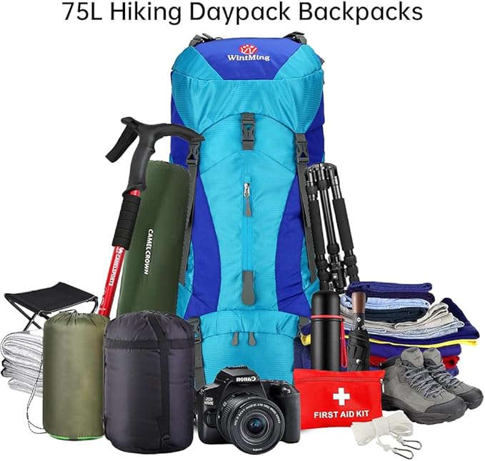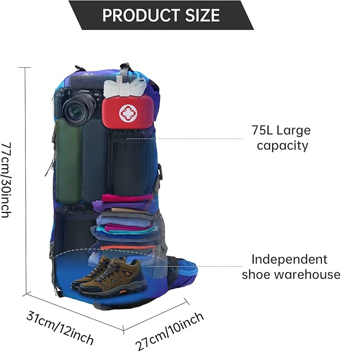 • Large Capacity Backpack: Travel backpack with 75L storage space(30 * 12 * 10inch), easily hold all your camping and hiking essential stuffs, multi-compartments design are convenient enough to help you further organize things, and designed a separate shoe warehouse.