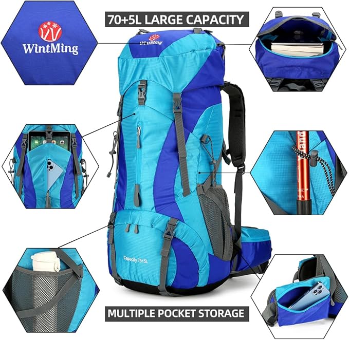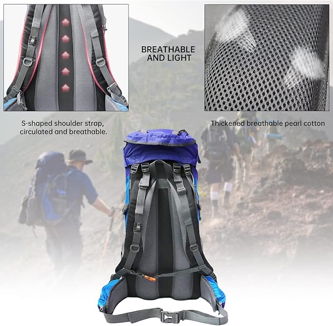 King'sGuard Hiking Backpack for Men and Women 70L+5L Waterproof Lightweight Camping Daypack with Rain Cover for Outdoor Travel Mountaineering - Frameless (Blue)