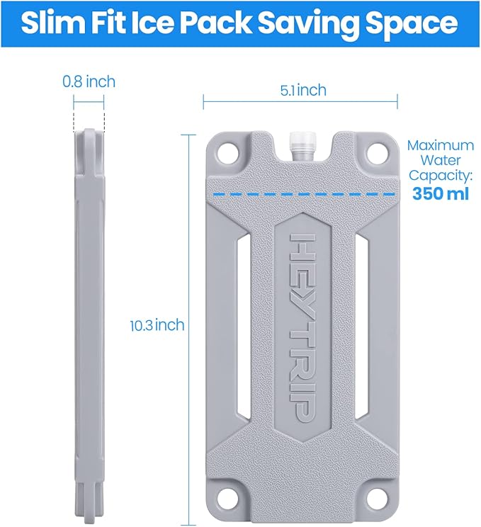 • Slim-Fit & Space Saving - Best size for cooler: 10 x 5 x 0.8 inch. Instead of putting ice cubes into the cooler and wasting space, try Heytrip slim-fit ice pack. Heytrip reusable ice packs for cooler bag with slim-fit design save space for a least three tins of coke in a cooler bag, perfectly fit your cooler bags, lunch boxes, and picnic baskets.