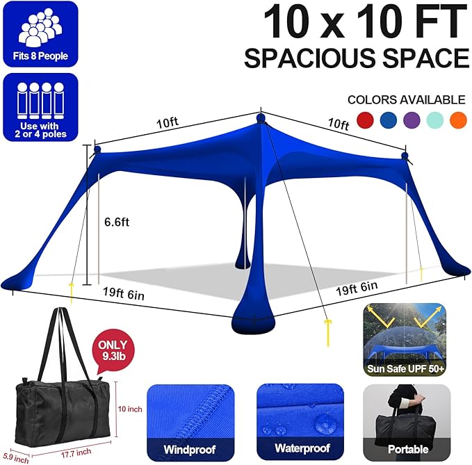 • UV Protection and Waterproof:Beach tent pop up sun shelter 10x10ft is made of high stretch Lycra fabric which is waterproof, windproof, sun protection, lightweight so that you will never worry about any stretches and tears. Our beach shade canopy offering UPF 50+ sun coverage to keep you and your family from the harmful UV rays and reduce sun burn or glare making it ideal for kids or adults laying out. This large sun tents for long-term outdoor use