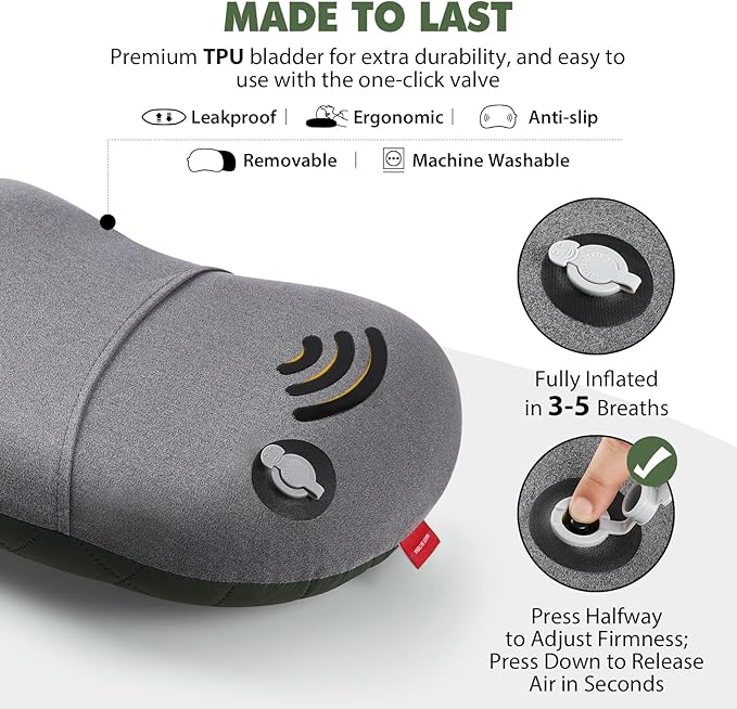 • 𝐓𝐇𝐄 𝐏𝐄𝐑𝐅𝐄𝐂𝐓 𝐏𝐈𝐋𝐋𝐎𝐖𝐒 𝐅𝐎𝐑 𝐀𝐋𝐋 𝐒𝐋𝐄𝐄𝐏𝐄𝐑𝐒: No matter which types of sleepers you are, Hikenture camping pillows for sleeping with the adjustable firmness were designed for your sleep position! Thanks to the patented one-click valve, our blow up pillow only takes 3-5 breaths to fully inflate. Press down the black button of the valve to release air in seconds, and press halfway to adjust the hiking pillow to your favorite firmness.