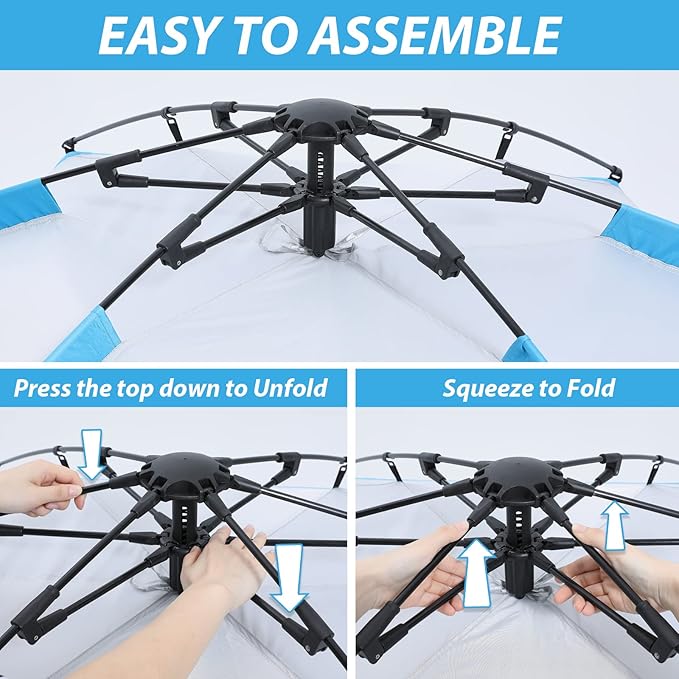 • 🏆Easy to Set up & Take down: Our beach tent comes with an Automatic Folding System. “one press” to unfold,“one squeeze” to fold, no assembly required, save time and effort, lightweight and stable, not easily damaged. easily damaged.