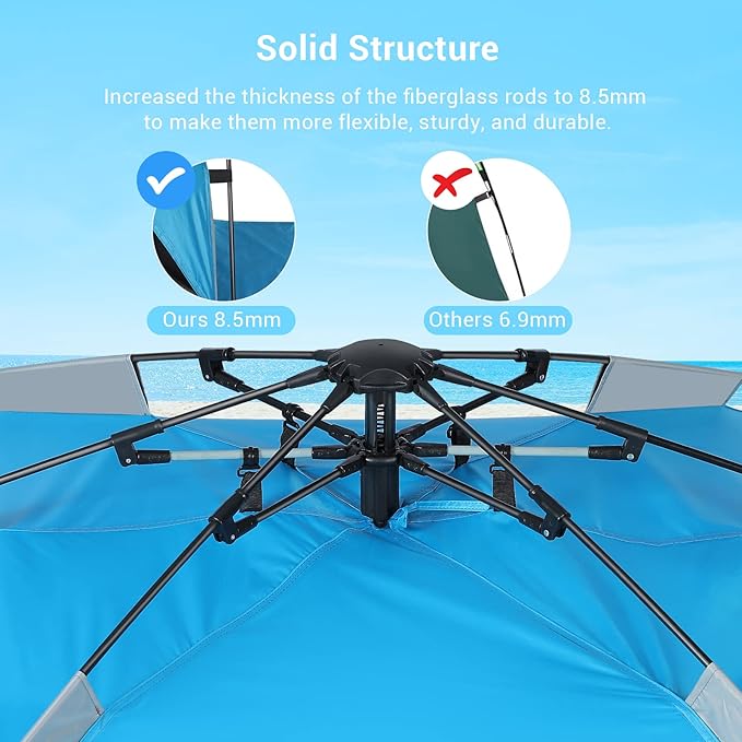 • 【Solid Structure】8.5mm Thickened Fiberglass Rods automatic bracket structure instant setup in seconds. Time-saving reduces effort. We increased the thickness of the fiberglass rods to 8.5mm to make them more flexible, sturdy, and durable. It can support the tent more stable and will keep its shape even after a long time of use