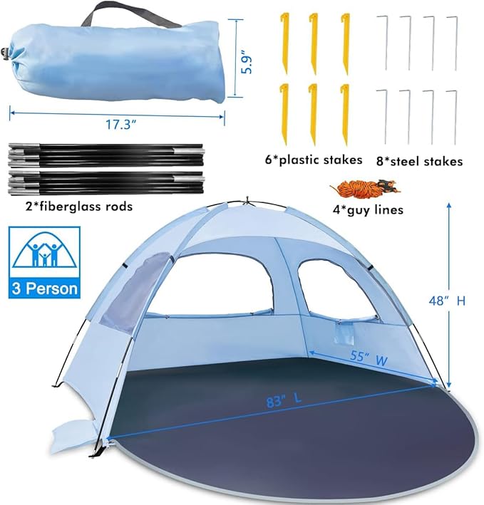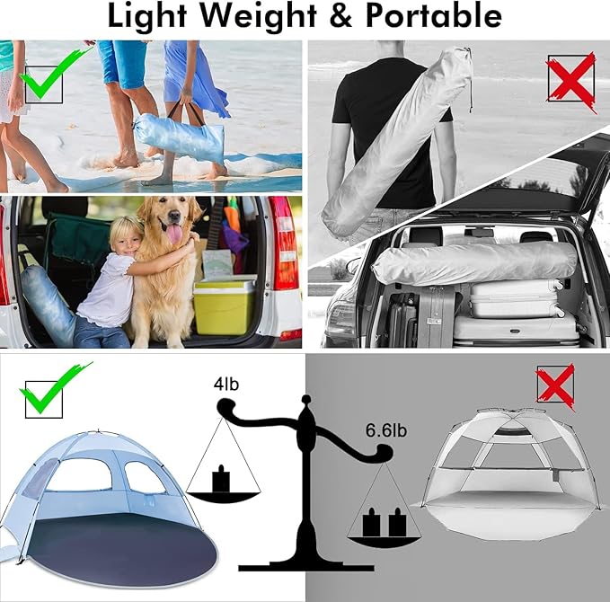 • Light Weight & Portable: Our beach tent is light weight, portable and easy to fold down with a compact carrying bag. Small size makes it easier to travel and store. It's convenient to carry anywhere you want. Just go on a beach trip with your family! (Tips: It is recommended to enlist a helping hand from another person for an easier assembly and setup)