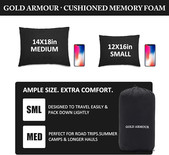 • COMFORTABLE: Our Gold Armour pillow is stuff with cushioned memory foam and wrapped in a soft, micro-suede cover. This travel pillow gives you a well deserved supportive rest that your head and neck will thank you for! Our compressible pillow can also be used as a seat cushion too