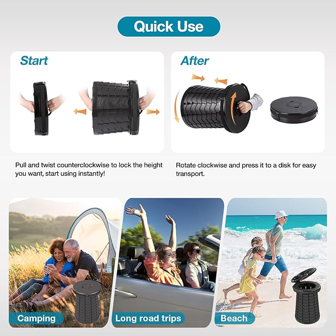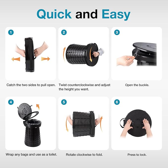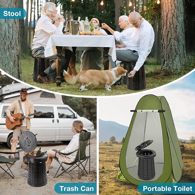 • 【MULTI-FUNCTIONAL】 Functional cover design, makes you free to switch various modes of use, as a camping toilet, a collapsible stool, a storage box,a side table or a trash can. It is not only a perfect portable toilet for camping, hiking, long trips, fishing, boating, traffic jam etc. But also a good portable potty for adults and kids indoor.