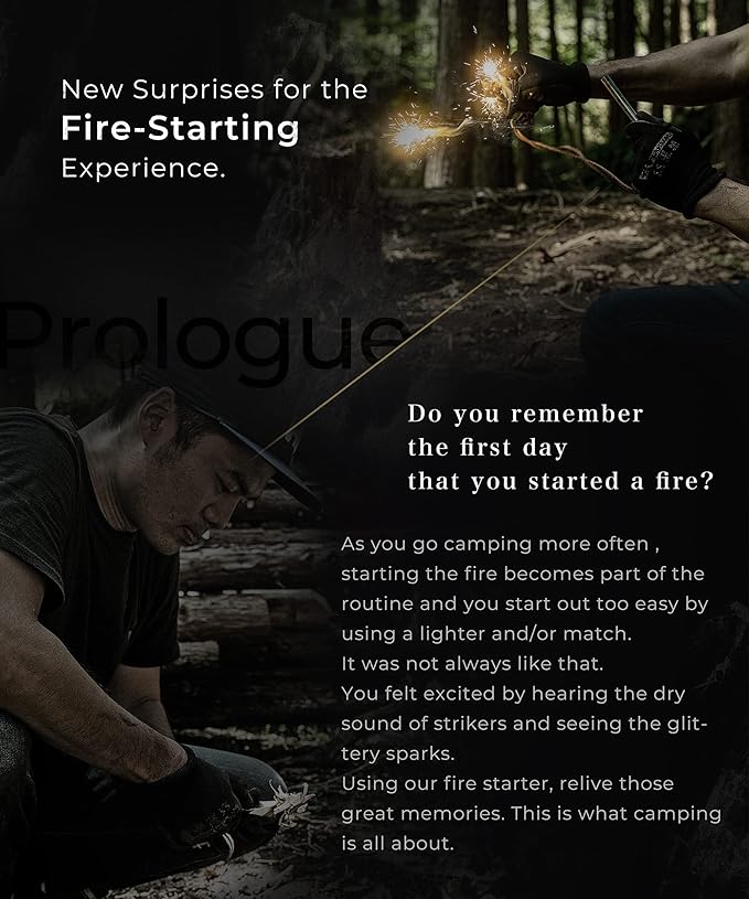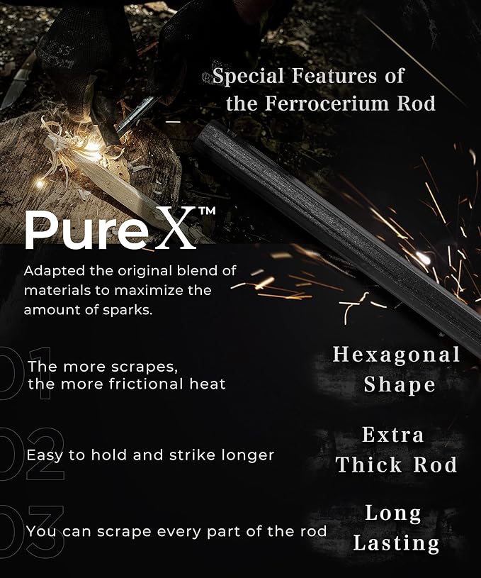 • 【Special Features of the Ferrocerium Rod】We prepared this extra thick rod made out of ferrocerium, which is superior to magnesium for ignition. You can create hot sparks that are about 3,000℃. We used Pure-X, our original blend of materials, which makes our ferro rod the perfect firmness to provide many sparks to start the fire. ・In order to make sparks, amount of scrapes from the rod and instant frictional heat caused by the striker are two important things.