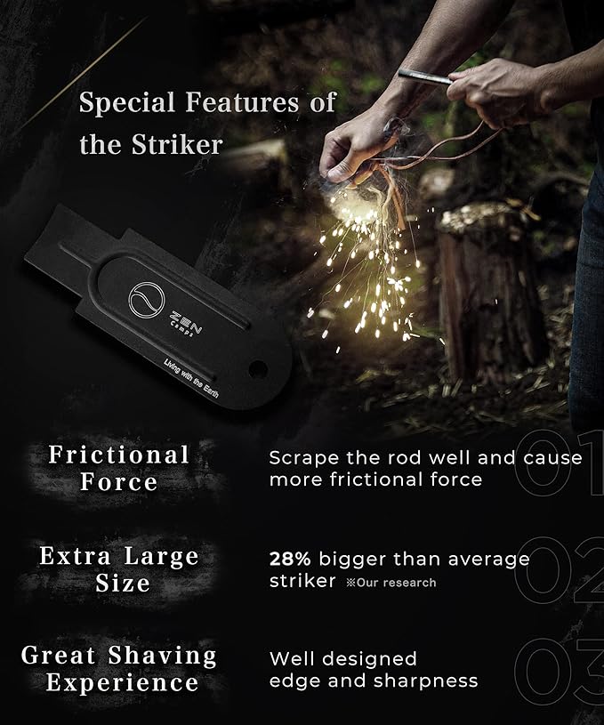 • This is the fire starter that ZEN Camps took more than a year to develop. A ferrocerium rod with perfect firmness and shape. A striker that is well made for the maximization of sparks. These 2 components have been implemented into our product to achieve a new level of ignition power. Totally recommended for those who had difficulties using other fire starters and/or beginners. This is a Must-Have item for bush craft!