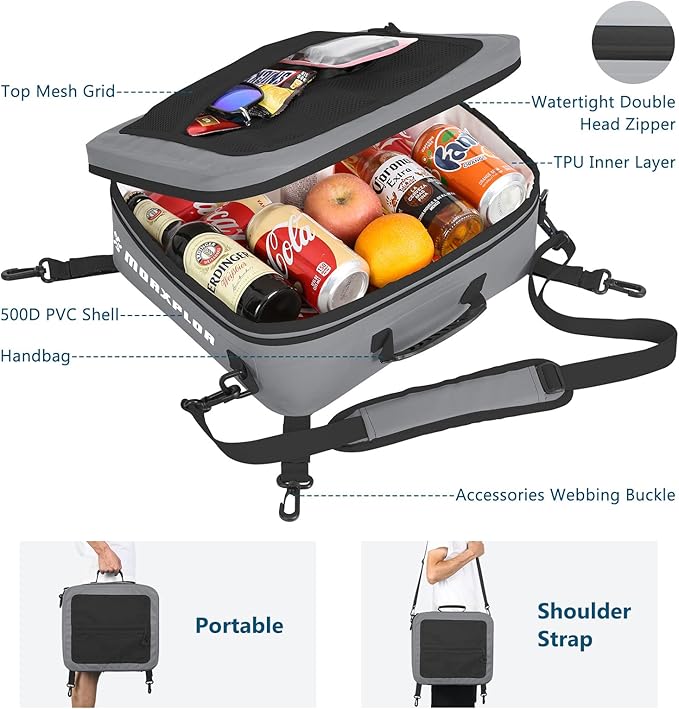 • Paddleboard Cooler Mesh Top Pocket Easy &Reliable to Use:The zipped mesh top keep your items handy and organized.The included hooks allow easy installation to D-rings and bungees.The side handle makes carry the waterproof sup cooler and deck bag like a breeze.