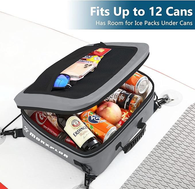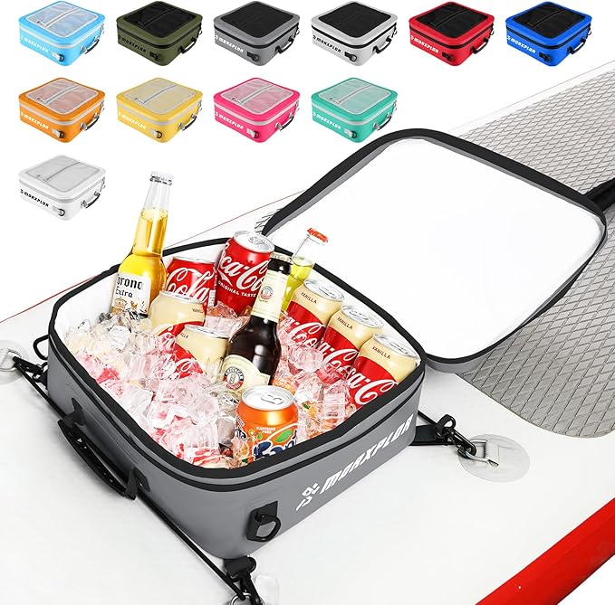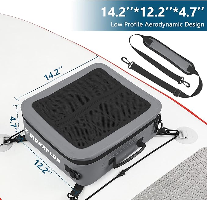• Ideal Paddleboard Accessories Cooler and Deck Bag:MORXPLOR paddleboard deck cooler bag easily fit 12 cans or equivalent amount of food for your day-long excursion.Size:14.6”x13”x4.7”.