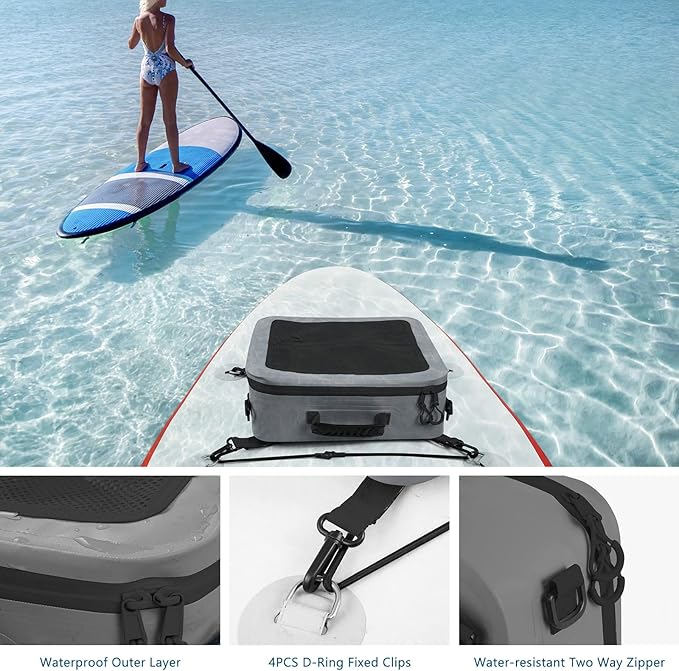 • Cooler Bag for Paddleboard with Waterproof Material 500D PVC:All seams and handles are all electrowelded together to ensure structure strong to make sure this deck paddleboard cooler bag have longer service time.The truly waterproof material will keep your bag under low temperature for longer time than common sewing paddle board cooler.