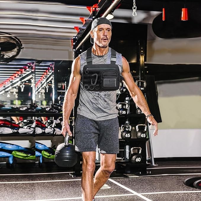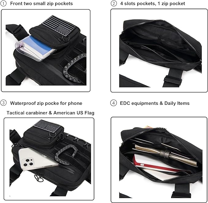 • 🍓 Workouts Chest bag for Men with Tactical style. We provide one carabiner & American Flag Embroidered Patch for each bag. We believe they can make this bag more Professional and Attractive.