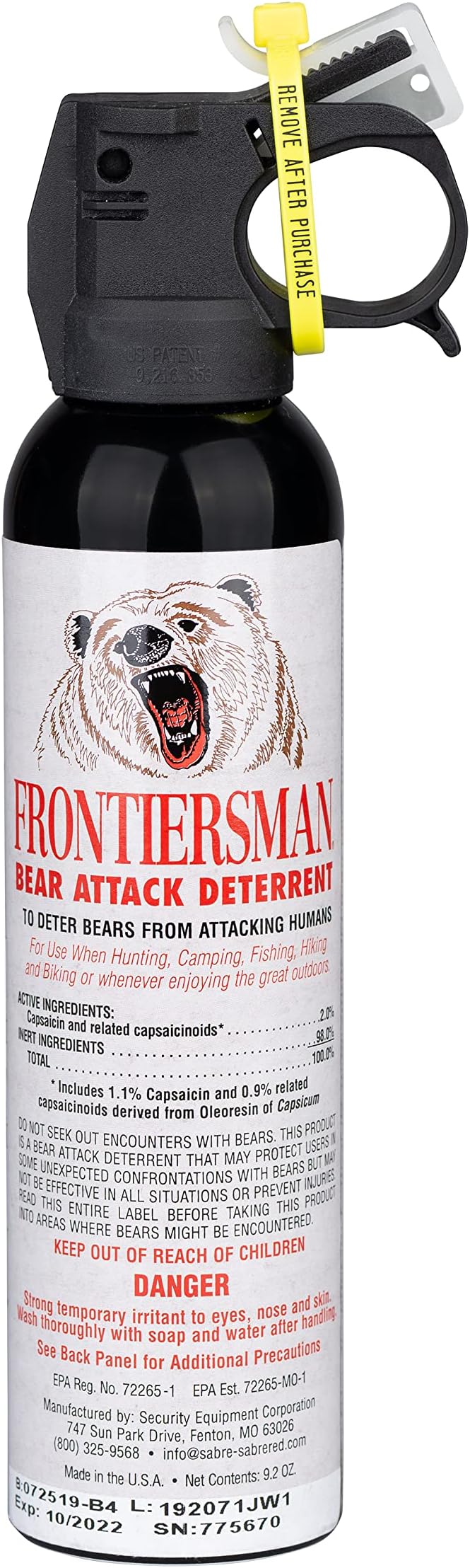 SABRE Frontiersman 9.2 fl oz. Bear Spray, Maximum Strength 2.0% Major Capsaicinoids, Powerful 35 ft. Range Bear Deterrent, Outdoor Camping & Hiking Protection, Quick Draw Holster & Multipack Options