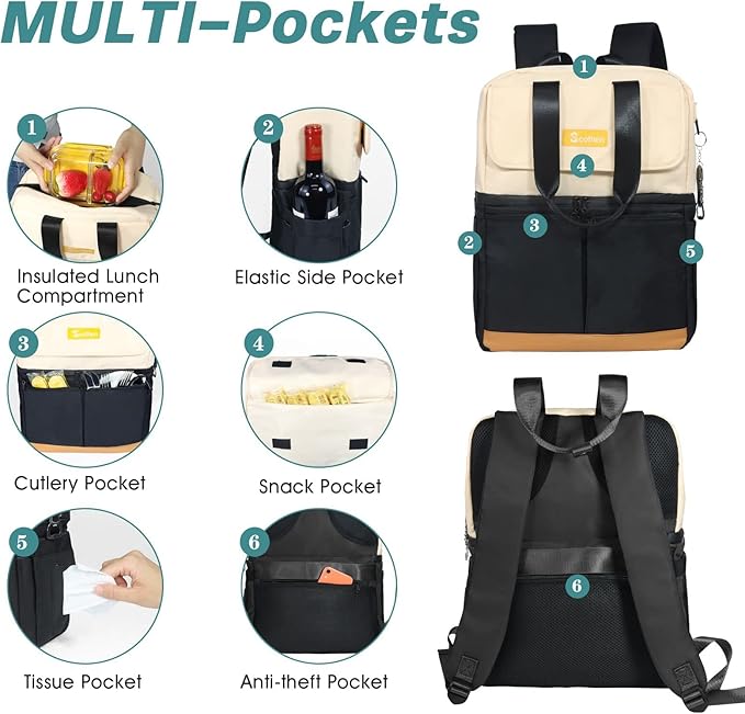 • 🍱Hot & Cold Separation Design: Our cooler backpack with double decker is design for women. A bottom compartment for cold, fresh contents that can also house ice packs, and an upper compartment for warm, dry goods and lunch. We recommend storing hot and cold foods and drinks separately for better results. It is a must-have backpack cooler for women hiking! It can also be used as a diaper bag backpack to keep your drinks 🍹 cold and keep your breast bottle 🍼 warm!