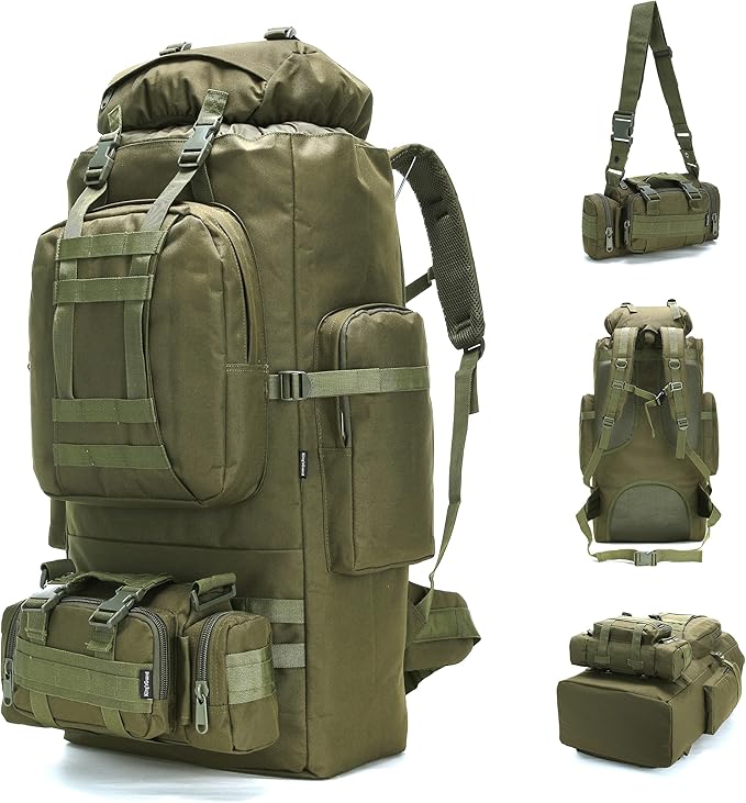 • 【Hiking Backpack and Waist Bag Size】: This waterproof lightweight hiking backpack size 15.35 * 8.66 * 31.49 inches (L x W x H), mountaineering backpack weighs only 3.63 pounds / 1.64 kg, carrying waist bag size 15.74 * 3.93 * 6.69 inches (L x W x H) waist bag only It weighs 0.99 lbs/0.47 kg and will not add burden to your travel.The military tactical bags is suitable for camping, hiking, hunting, camping, climbing. It can replace a suitcase.