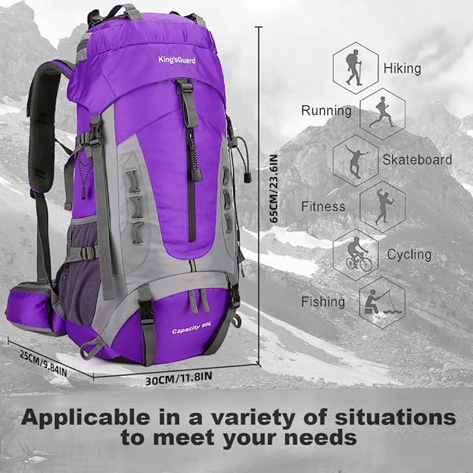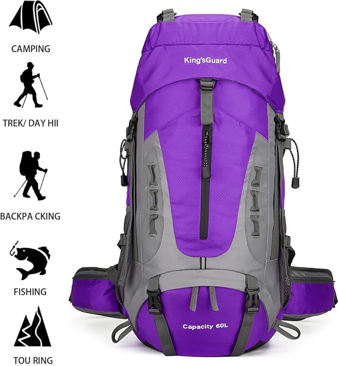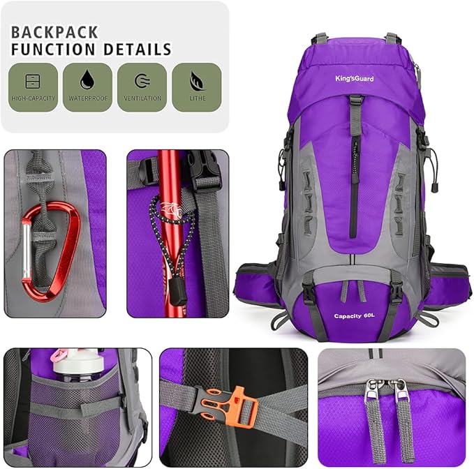 King'sGuard 60L Hiking Backpack Men Women Camping Backpack Waterproof Backpacking Mountaineering Climbing Daypack with Rain Cover (Purple)