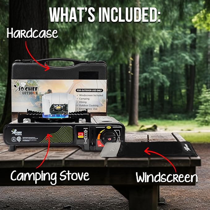 • ✔️ CSA CERTIFIED FOR SAFETY- The JoChef Camp Stove Butane Burner is CSA certified, meeting the rigorous industry standards for use with butane fuel. JoChef camping cooking stove includes a safety lock feature, built-in pressure sensor protection, and gas leakage protection.