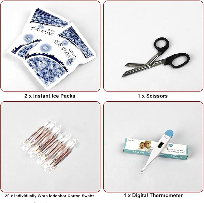 • First Aid Kit Survival Sets: Camping supplies comes with bandage adhesive strips, plastic scissors, emergency blanket, ice pack, and other multi-use items for any possible potential emergency, such as cold weather while traveling outdoors, accidental falls and sprains during sports, or accidental burns at work.