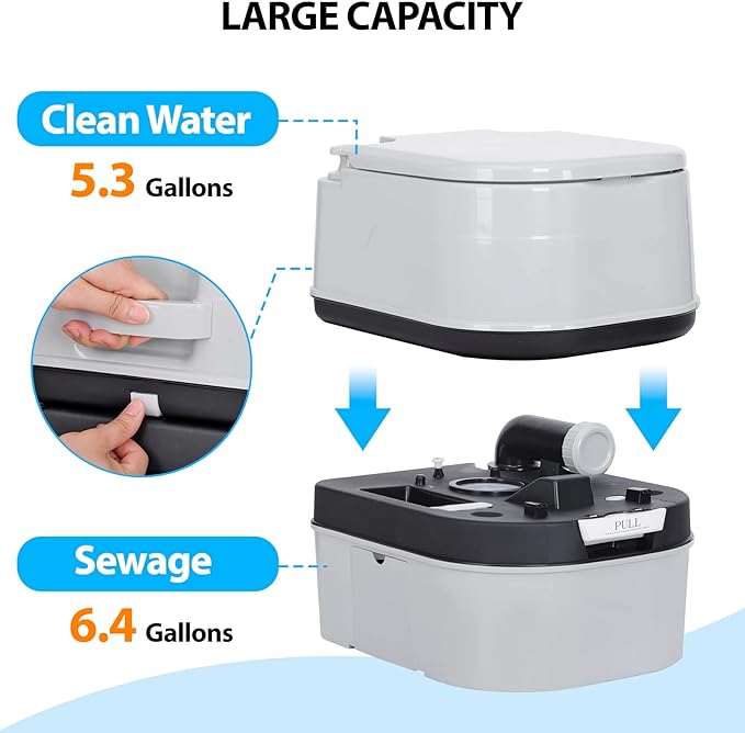 • LARGE CAPACITY - The toilet has a large capacity; The upper layer has a capacity of 5.3 gallon for storing clean water, and the lower layer has a capacity of 6.4 gallon for sewage storage; The upper and lower layers can extend the use time of the toilet and meet the needs of people with indoors disabilities or outdoor activities