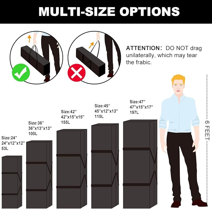 • Easy To Transport: When not in use, duffel bag folds into a flat, compact size for easy storage, taking up no space. Long duffle bag has plenty of room for storing items, good for travel and use as a tent bag, camping, cargo bag, gear bag, overnight lightweight bag, and equipment bag for all sports. Tote travel bag comfortable and convenient to carry on, and the perfect size for the seat in the car or plane