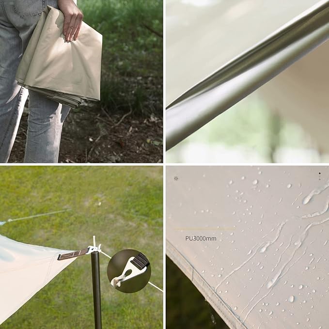 • WATERPROOF: Puraville camping tarp rain fly is made of super solid 210D rip-stop polyester, combined with PU 3000mm waterproof coating and leakproof-taped seams technology, which could effectively protect your camping gears from rainy or snow days. Fixed with six wind-resistant steel stakes, you can set up a safe campsite in minutes without need to worry its security.