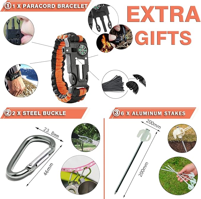 • Included Components : 1 x Paracord Compass Bracelet, 2 x Carabiners Clip, 1 x Camping Tarp, 1 x Portable Bag, 6 x Guylines with Adjuster, 6 x Aluminum Stakes 1 x Paracord Compass Bracelet, 2 x Carabiners Clip, 1 x Camping Tarp, 1 x Portable Bag, 6 x Guylines with Adjuster, 6 x Aluminum Stakes