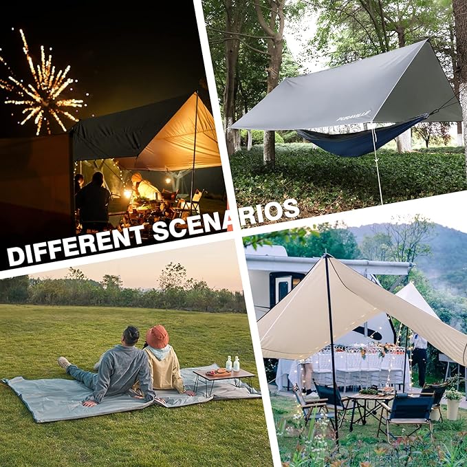 • VERSATILE & MULTI-PURPOSE: This rectangular rain fly is large enough to cover your entire camping crew (4-6 person) and all camping gears (including your tent, hammock, camping tables and chairs). Whether you suspend the tarp from trees as a hammock coverlet, or regard it as backpack tent tarp, sun shade, ground sheet, canopy tent or rain shelter, this tarp will provide you enough space, comfortable experience and maximum protection.