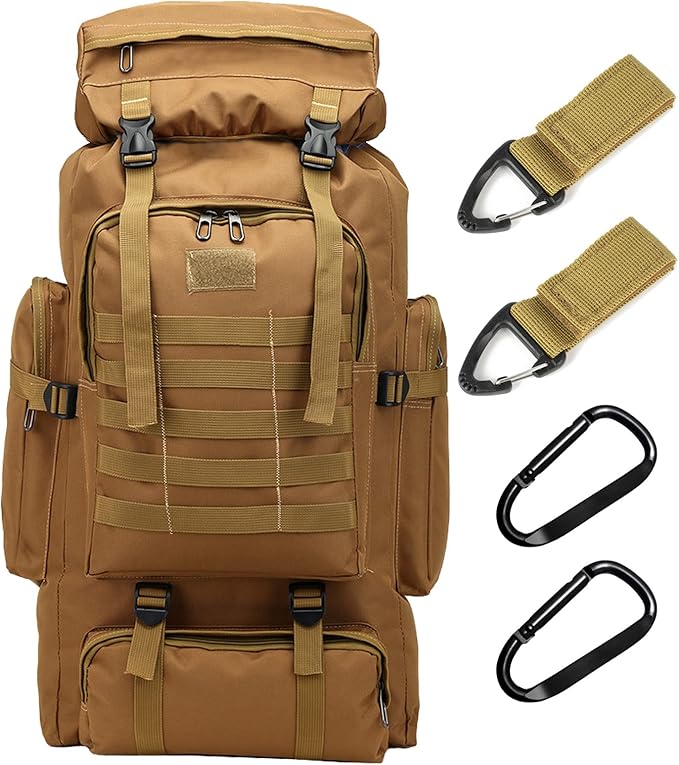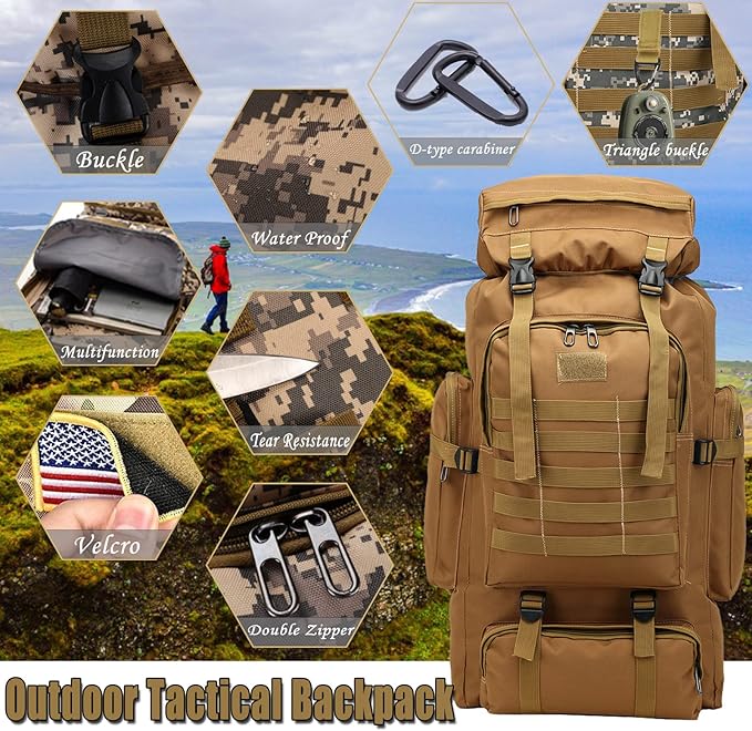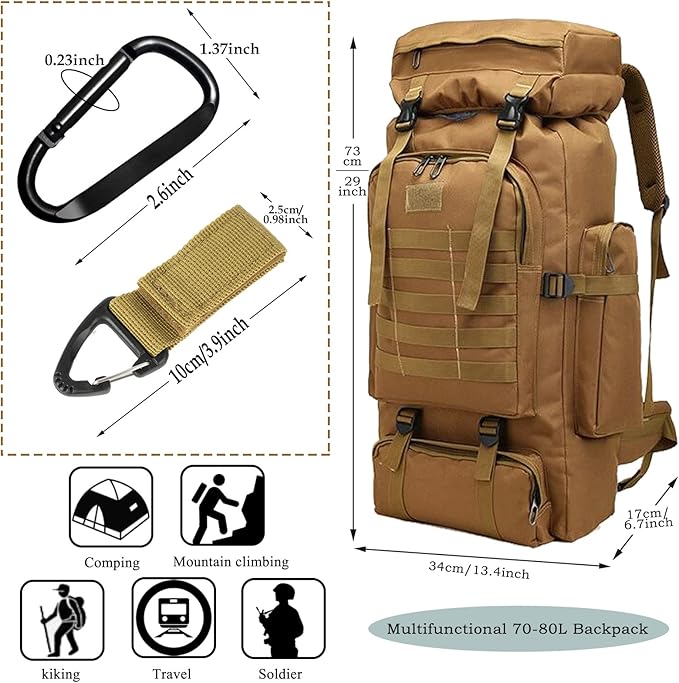 • 70L Large-Capacity: Military rucksuck is made of 600D Oxford fabric and waterproof materials, making it more robust, durable, tear-resistant, and scratch-resistant compared to other hiking backpacks. With a massive 70L capacity, this packable backpack is suitable for your one-week journey, accommodating items such as sleeping bags, clothing, shoes, notebooks, and more.
