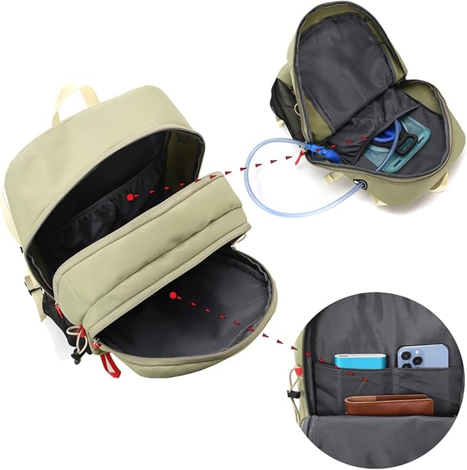 • Multi Compartment :Generous main compartments and multiple pockets allow you to keep all of your gear secure and organized.The spacious main compartment holds sleepingbag, clothes, or other everyday essentials. With one Interior Pouch for water bladder.It also has a front pocket with a zipper. The elastic cord is designed to store items that need to be easily accessible. In addition, it has two side pockets for your water bottle or umbrella.